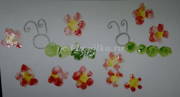 Затем обмакиваем пальчик в красный цвет. Аналогично, создаем узор второй бабочке.